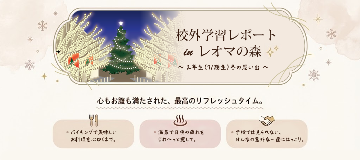 年末も押し迫った2025年12月18日、2年生(71期生)全員でレオマの森へ校外学習に行ってきました。バイキングで、おいしい料理をお腹いっぱい食べ、温泉に浸かり、今まで知らなかったクラスメイトの一面を見ることもできました。